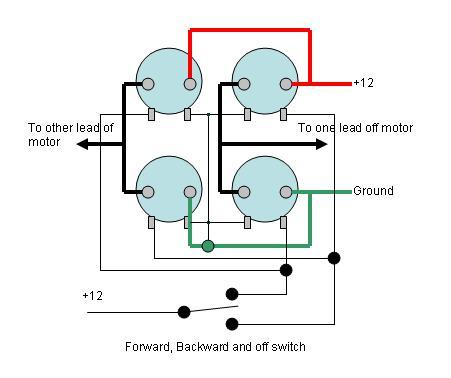 Although solidstate is one of the best forms of control (with the added function of speed control), the relay option is probably the simplest way to get around a "direct inline" type of control. A relay configuration to control both forward and reverse directions on a motor is known as an H-Bridge. The following diagram explains the setup: